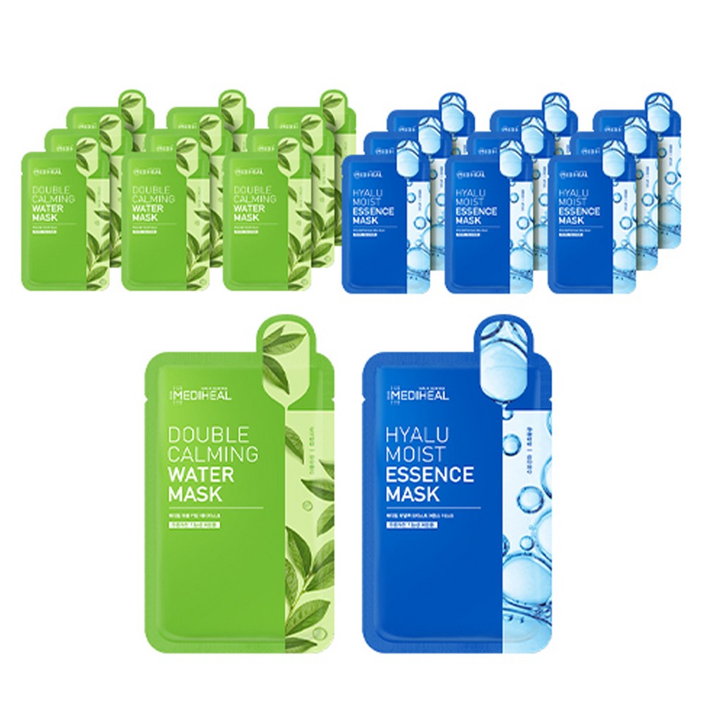 MEDIHEAL Double Calming Water Mask + Hyalmoist Essence Mask, 20 Count, 1 Pack